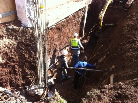 התמונה מראה חפירות ליסודות חדשים, חשיפה וחיזוק של יסודות קיימים של המבנה.